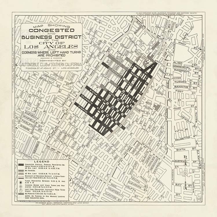 Este es uno de los primeros mapas del mundo para automovilistas. La leyenda en la esquina inferior izquierda te muestra una clave de la información disponible en este mapa, incluyendo restricciones de estacionamiento, cuándo y dónde se permiten giros a la izquierda, y el "distrito congestionado" donde el estacionamiento está prohibido durante las horas pico.