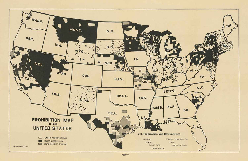 Como puedes ver, para 1915, gracias al trabajo inicial de los prohibicionistas, el alcohol ya estaba prohibido en muchos estados rurales, con las notables excepciones de Minnesota, Nevada y Montana. La mayoría de las áreas metropolitanas tenían licencias de alcohol que controlaban tanto la producción como el consumo de alcohol.