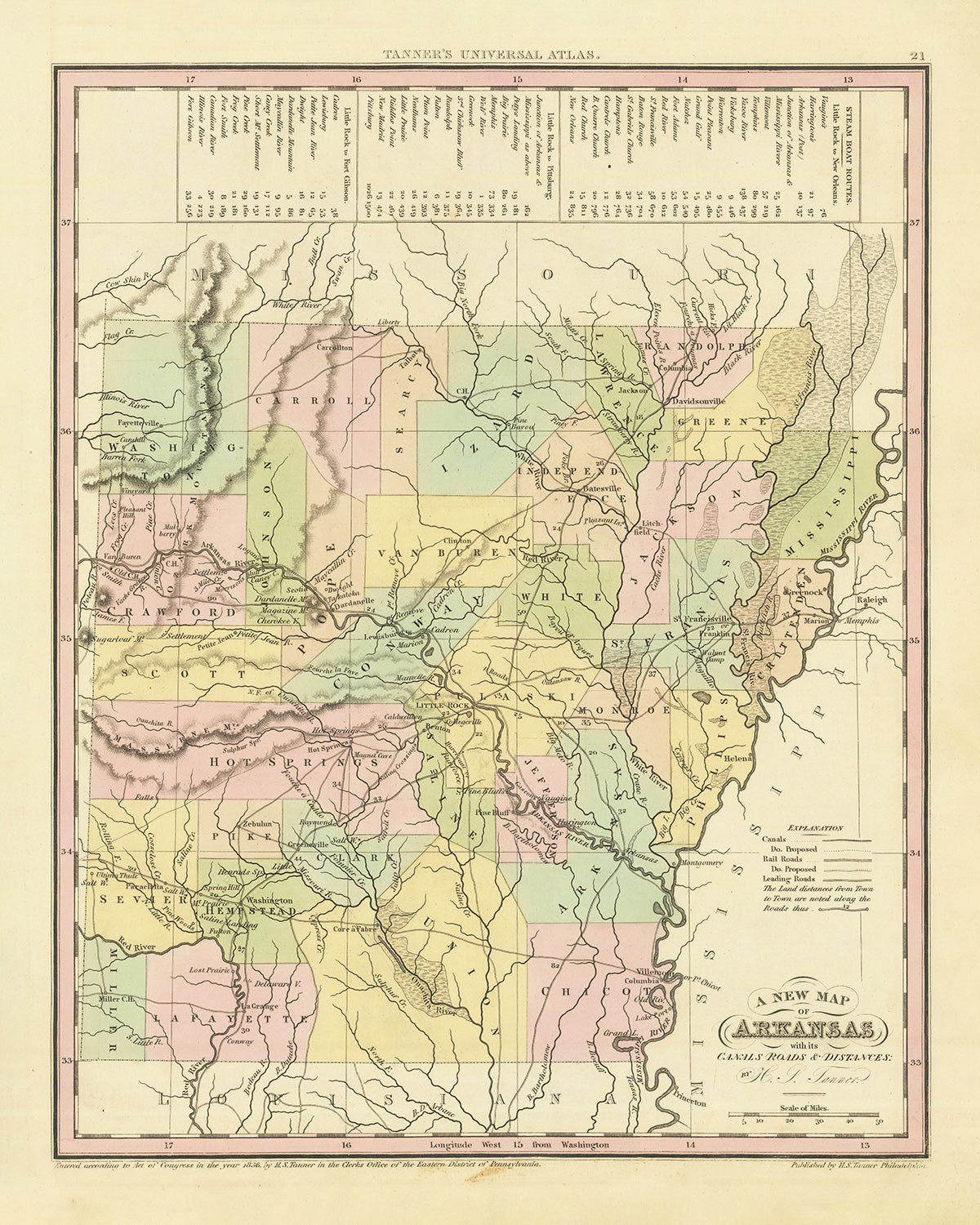 Mapa antiguo de Arkansas por H. S. Tanner, 1836: Little Rock, Fort Smith, Pine Bluff, Batesville, Washington, Carreteras, Ferrocarril, Canales