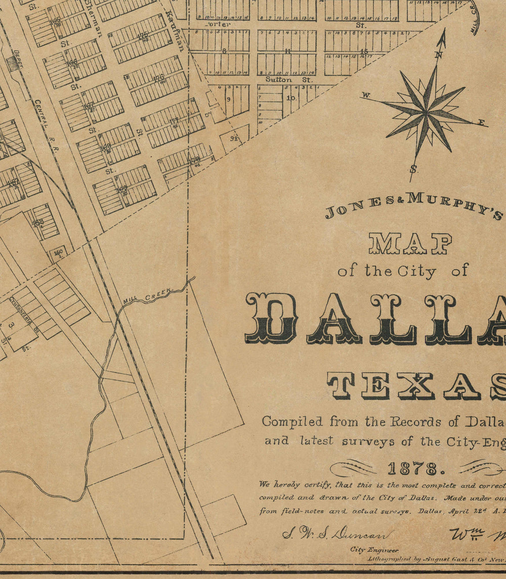 Mapa antiguo de Dallas, Texas en 1878 por Jones & Murphy: Main St, Ellum, Downtown, Distrito de Arte, Bryan Place