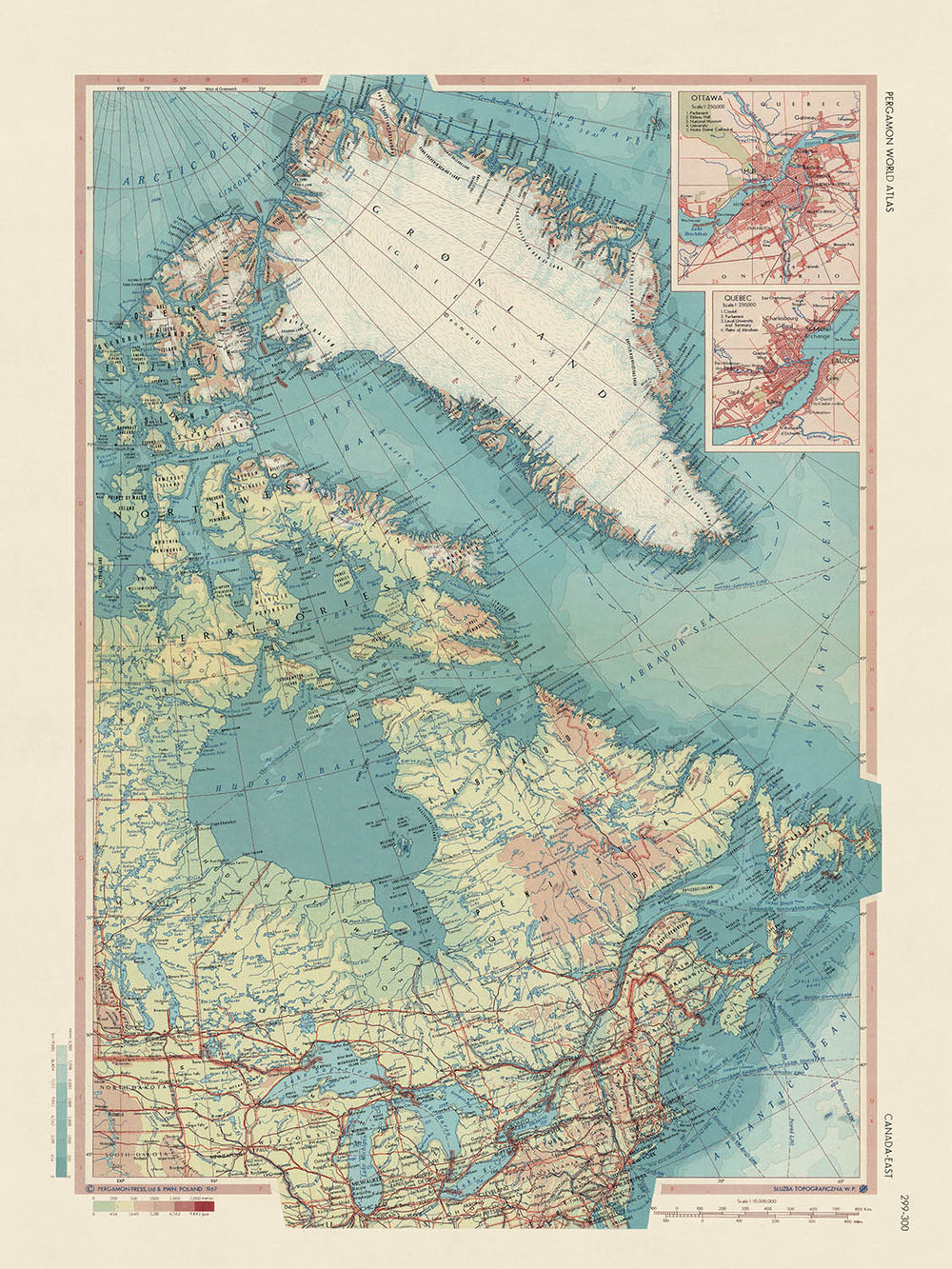 "Canadá - Este", una creación magistral del Servicio de Topografía del Ejército Polaco en 1967, es un mapa político y físico detallado que encapsula brillantemente la grandeza y diversidad del Este de Canadá. El mapa, con su meticulosa atención al detalle, muestra la vasta extensión de Ontario, Groenlandia, Terranova y Labrador. El estilo del mapa es una elegante mezcla de mapeo político y físico, ofreciendo un rico tapiz de la topografía de la región y las fronteras políticas. Esta mezcla de estilos lo convierte en un mapa de país interesante, ya que presenta una visión integral de las características físicas del país junto con sus divisiones políticas.