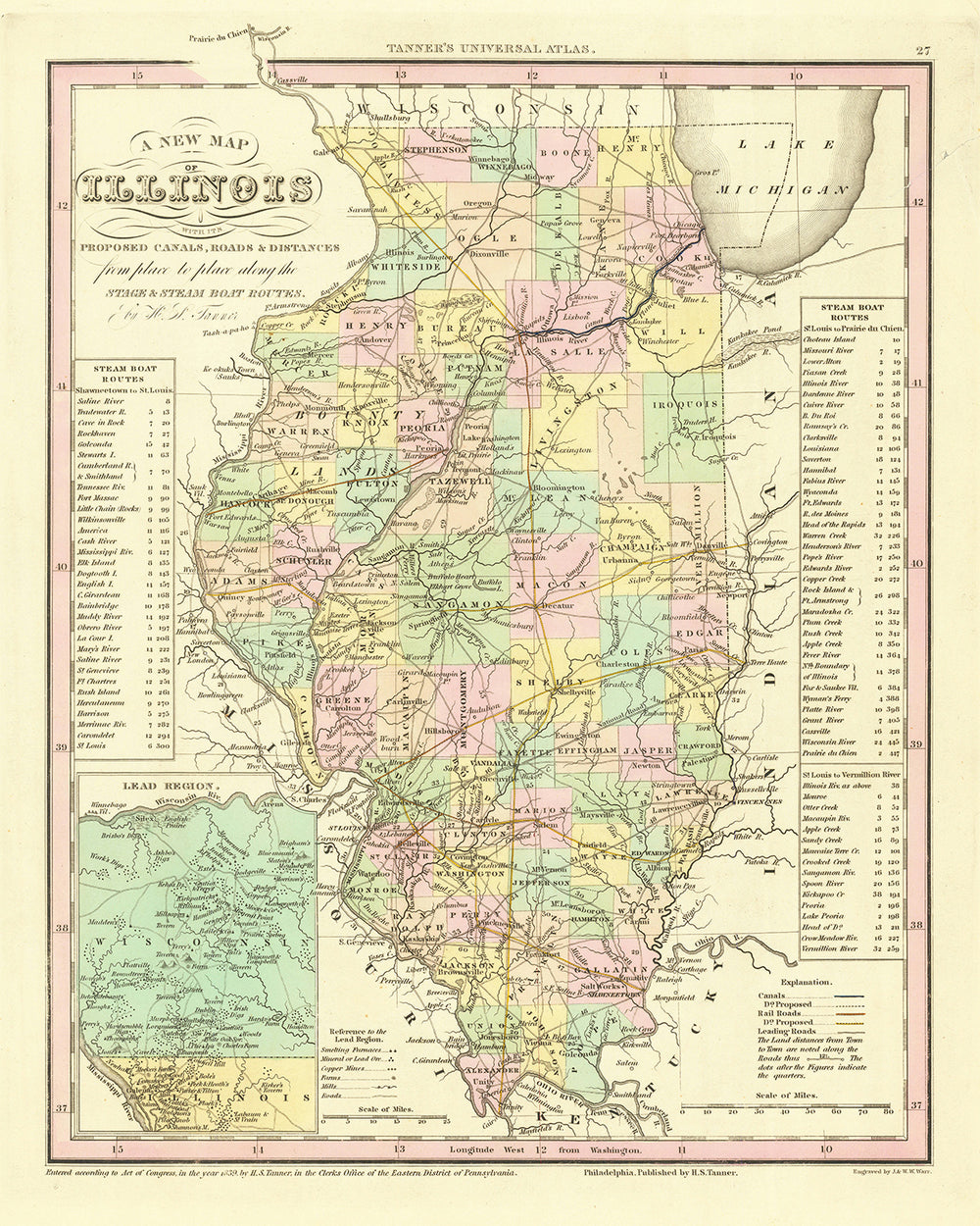 Mapa antiguo de Illinois por H. S. Tanner, 1836: Chicago, Aurora, Rockford, Joliet, Naperville, Carreteras, Ferrocarril, Canales