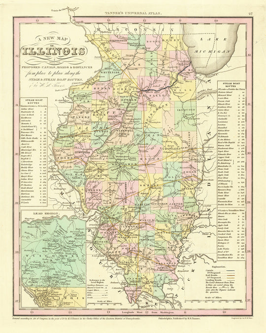 Sumérjase en el encanto del Illinois histórico con este exquisito Mapa antiguo de Illinois, cuidadosamente elaborado por el estimado cartógrafo Henry Schenck Tanner en 1836. Este mapa bellamente conservado, que incluye detalles intrincados de canales, carreteras, ferrocarriles y distancias de viaje, ofrece una ventana a una época fundamental del desarrollo de Illinois. Como testimonio inestimable de los inicios del estado, el mapa permite una exploración exhaustiva de Illinois durante una época de profundo crecimiento y transformación.