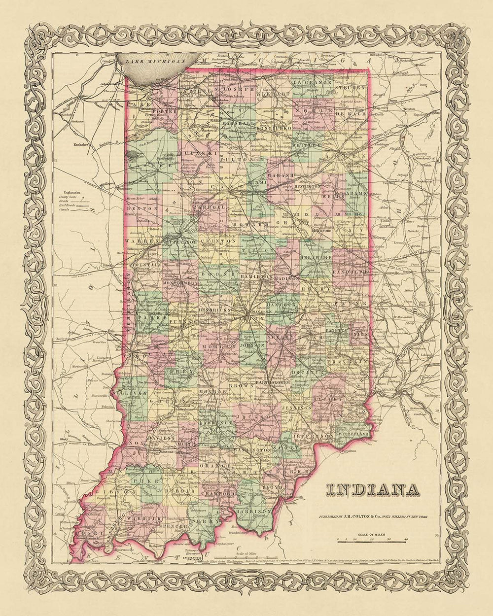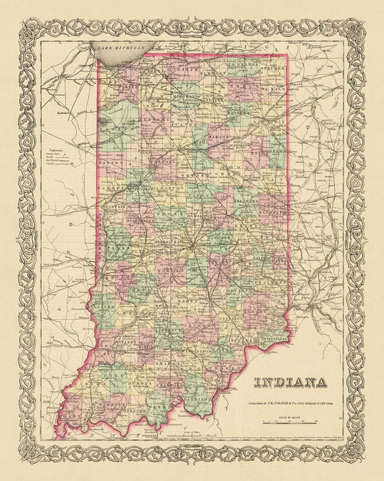El trabajo de JH Colton, ampliamente considerado como el mejor cartógrafo estadounidense de su época, se caracteriza por su excepcional atención al detalle y la precisión. Este mapa no es una excepción. Presenta los cinco asentamientos más notables de Indiana en ese momento: Indianápolis, la capital del estado y un centro clave de comercio y transporte; Fort Wayne, un puesto de avanzada vital en la frontera; New Albany, una próspera ciudad fluvial; Terre Haute, conocida por sus ricos recursos naturales; y Lafayette, un bullicioso centro de comercio e industria.