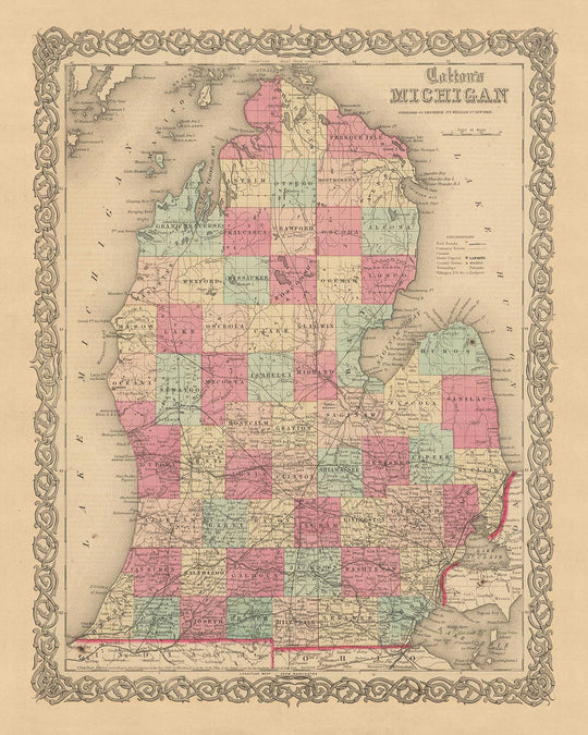 JH Colton, el creador de este mapa, es generalmente considerado el mejor cartógrafo estadounidense de esta época. Sus mapas son conocidos por su precisión, detalle y atractivo estético. Este mapa de Michigan no es una excepción. Exhibe el estilo característico de Colton y la atención al detalle, lo que lo convierte en una posesión preciada para cualquier coleccionista o entusiasta.