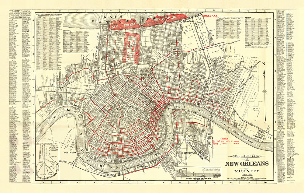 El antiguo mapa de Nueva Orleans creado por Guilot y Adam en 1925 ofrece una visión de la rica historia y la vibrante cultura de la ciudad. Este mapa detallado muestra los barrios emblemáticos de la ciudad, incluidos el Barrio Francés, Treme, Argel, Metairie y City Park. Cada uno de estos barrios tiene su propio carácter e historia únicos, lo que hace de este mapa un recurso valioso para cualquiera interesado en explorar el pasado de la ciudad.