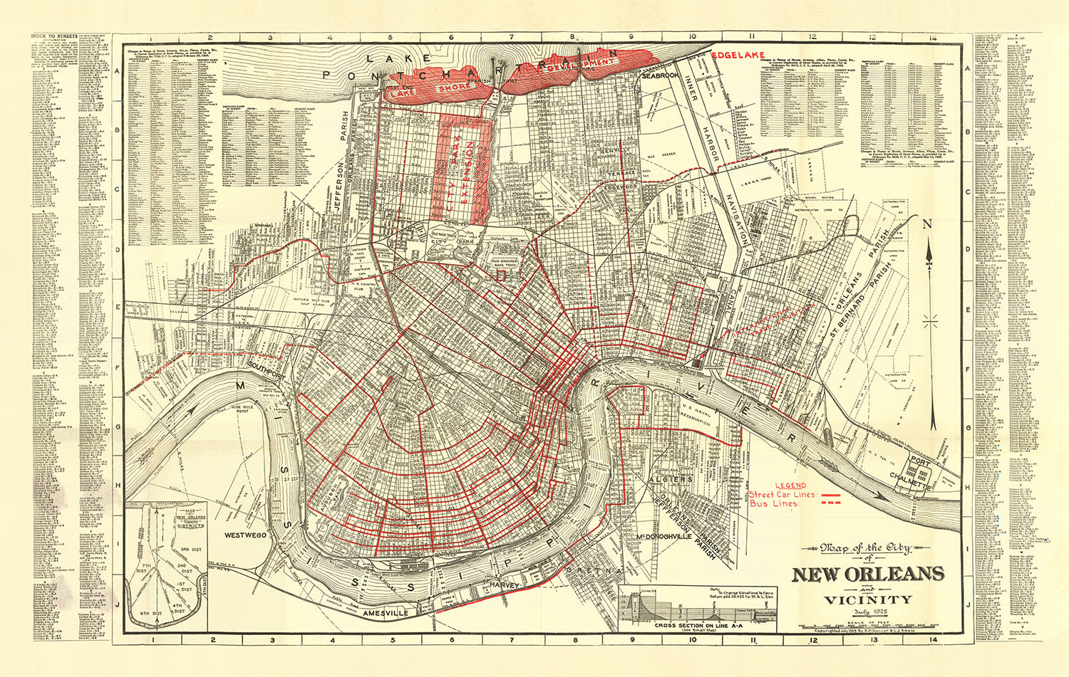 Mapa antiguo de Nueva Orleans de Guilot y Adam, 1925: Barrio Francés, Treme, Argel, Metairie y City Park