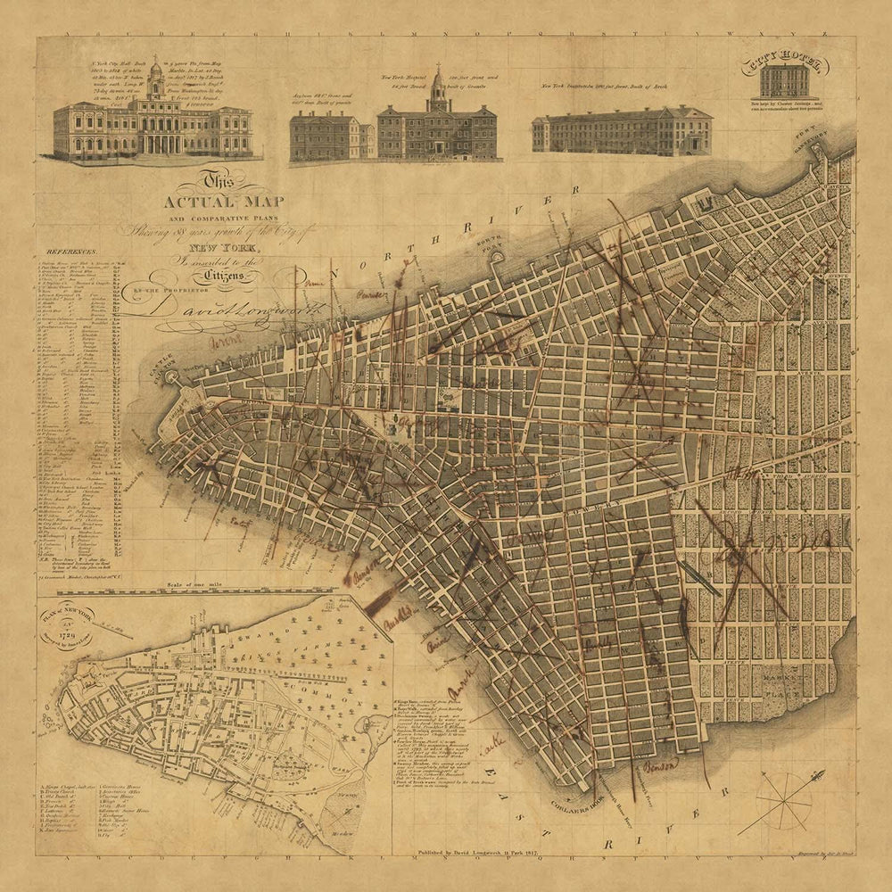 El mapa de Longworth está adornado con viñetas de hitos significativos, como el Ayuntamiento, el Hospital de Nueva York y el Hotel de la Ciudad, mostrando los logros arquitectónicos de la época. Estas ilustraciones no solo mejoran el atractivo estético del mapa, sino que también sirven como marcadores históricos de los hitos culturales y cívicos de Nueva York. El recuadro del plan de James Lyne de 1729 enriquece aún más su valor histórico, ofreciendo una vista comparativa del crecimiento de la ciudad a lo largo de casi un siglo.