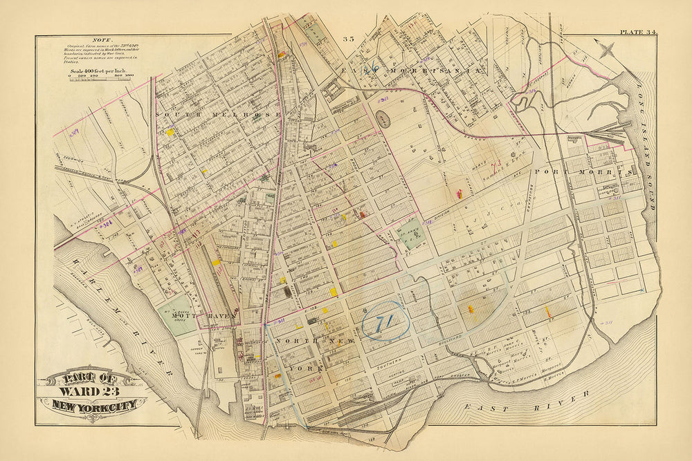 - Regiones mostradas: South Melrose, East Morrisania, Mott Haven, North New York, Port Morris y Mount Buena Grove.