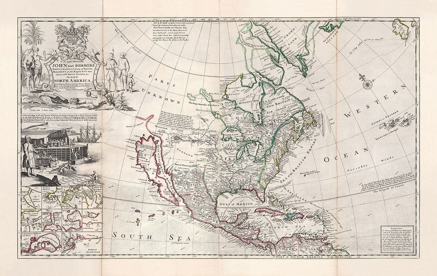 Este es uno de los mapas más antiguos y más detallados de toda la región del Atlántico, América del Norte y el Pacífico. Se compiló en un punto intrigante de la historia cuando la mayor parte del centro del continente se llamaba Luisiana o Nueva Francia, y México y la Costa Oeste fueron reclamadas por España. La costa este, por supuesto, fue reclamada por Inglaterra!