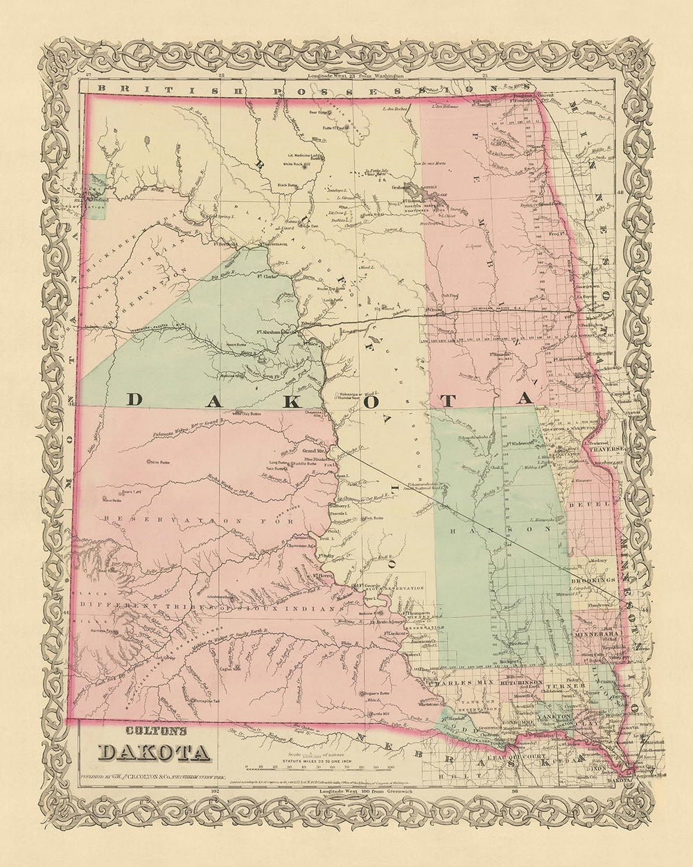 Sumérgete en la historia temprana de los Estados Unidos con este exquisito mapa de Dakota de 1873, meticulosamente elaborado por el estimado cartógrafo JH Colton. Este mapa proporciona una instantánea fascinante de la región, en una época en la que muchos de sus asentamientos estaban en su infancia y el paisaje era en gran medida inexplorado. Como uno de los cartógrafos estadounidenses más respetados de su época, el trabajo de Colton ofrece una precisión y atención al detalle incomparables, lo que lo convierte en una pieza verdaderamente única de cartografía histórica.
