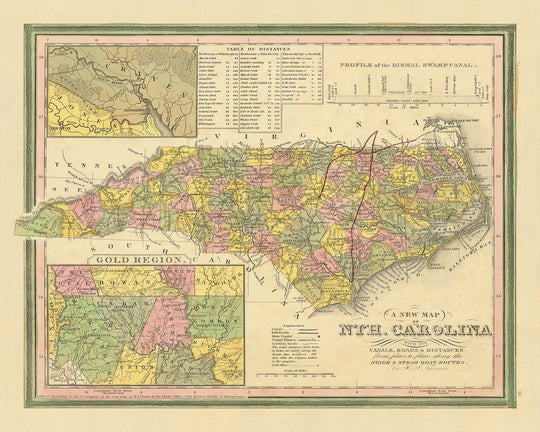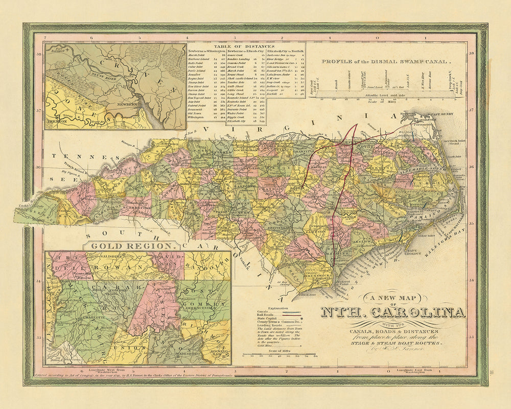 Este mapa bellamente detallado de Carolina del Norte de 1841 de Henry Schenck Tanner es imprescindible para cualquier aficionado a la historia o entusiasta de la cartografía.