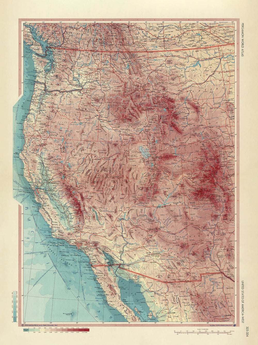 Este mapa de 1967 del oeste de los Estados Unidos, publicado por el Servicio de Topografía del Ejército Polaco, es un mapa político y físico detallado que proporciona una descripción completa de la región. El mapa cubre todo el oeste de Estados Unidos, desde la costa del Pacífico hasta Denver, Colorado, e incluye partes de Canadá y México. Presenta una gran cantidad de información, incluidas ciudades, pueblos, carreteras, ríos, montañas y parques nacionales, lo que lo convierte en un recurso invaluable para historiadores, geógrafos y cualquier persona interesada en la región.