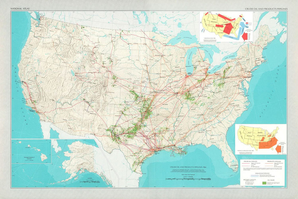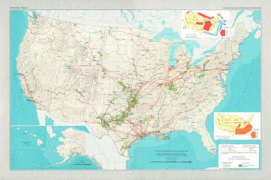 Adéntrate en el mundo de 1966 con el mapa de "Oleoductos y Productos de Petróleo", una pieza cautivadora elaborada por el Servicio Geológico de los Estados Unidos. Este mapa ofrece una vívida representación de la infraestructura petrolera de los Estados Unidos durante una era crucial, destacando la intrincada red de oleoductos y refinerías que impulsaron a la nación. Como parte de los "Mapas de temas especiales" en El Atlas Nacional de los Estados Unidos de América, este mapa no solo sirvió como una herramienta práctica para los tomadores de decisiones e investigadores, sino también como un testimonio de la potencia económica e industrial del país.