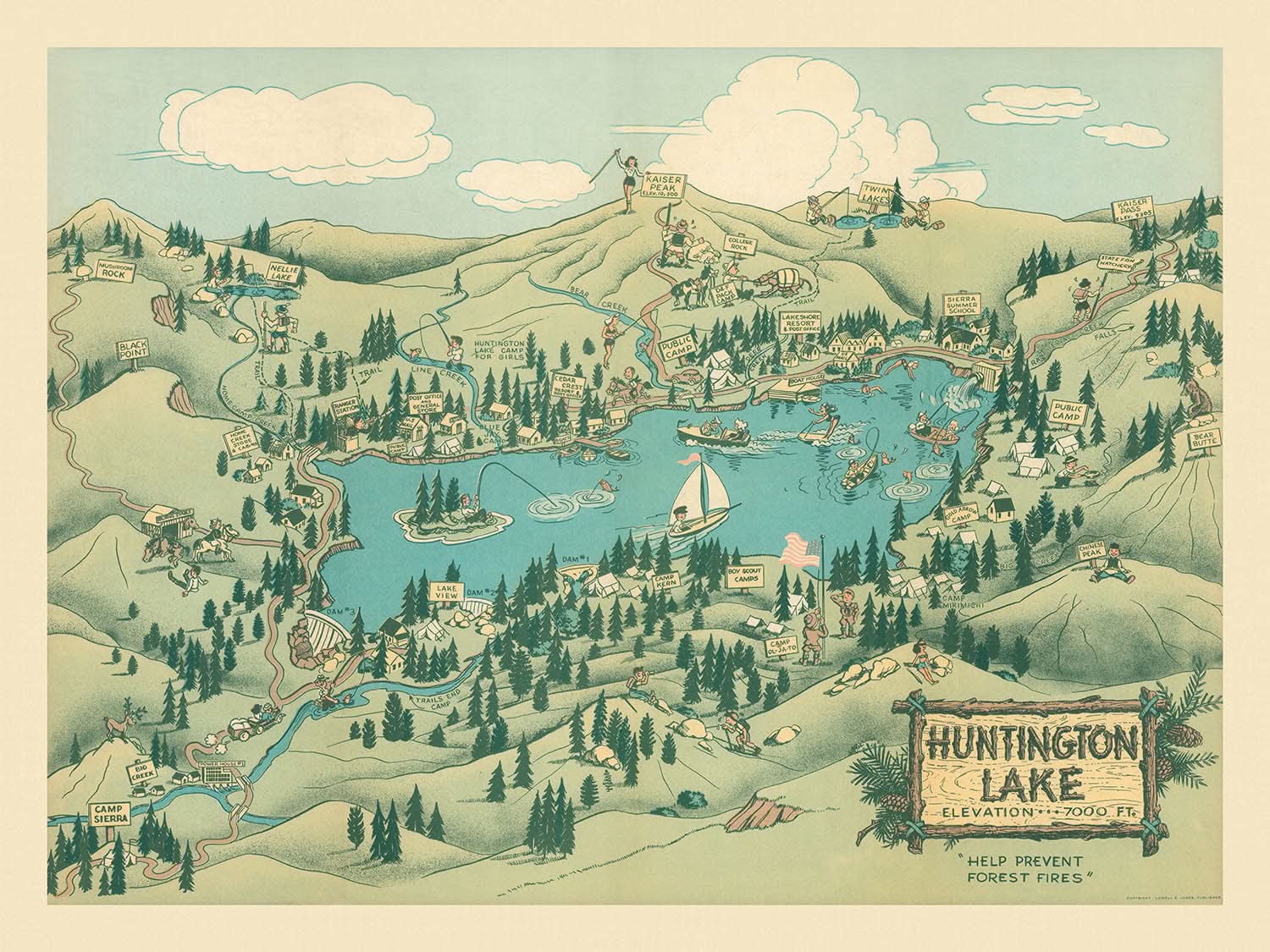 Antigua Mapa Pictórico del Lago Huntington, CA por Jones, 1940: Pico Kaiser, Lagos Gemelos, Campamentos, Senderos, Prevención de Incendios