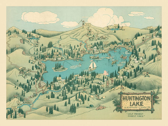 El mapa ilustra vívidamente la vibrante vida alrededor del lago Huntington, mostrando lugares populares como Kaiser Peak, Twin Lakes y los bulliciosos campamentos de Boy Scouts. Las actividades recreativas como la navegación, la pesca y la equitación están representadas de manera encantadora, capturando el espíritu de aventura que definió la época. La representación detallada de senderos y campamentos invita a la exploración, ofreciendo una sensación de comunidad y camaradería que floreció en este entorno idílico. Cada característica está dibujada meticulosamente, reflejando la combinación armoniosa de naturaleza y actividad humana.
