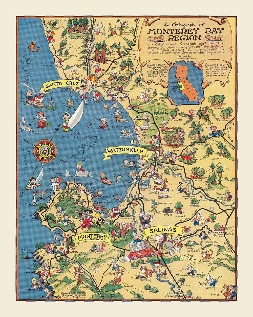 Beyond its agricultural focus, the map is a celebration of the Monterey Bay region’s rich tapestry of communities and landscapes. Major towns such as Santa Cruz, Monterey, Salinas, and Carmel are depicted with affectionate detail, while the Santa Cruz Mountains, Salinas River, and the dramatic Pacific coastline provide a stunning natural backdrop. The map’s pictorial style offers not only geographical orientation but also a sense of the vibrant daily life and recreational pursuits that made the area a magnet for visitors and settlers alike.