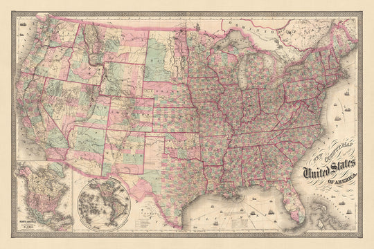 - Muestra todo EE. UU. en 1874, con mapas insets de América del Norte y el Hemisferio Occidental