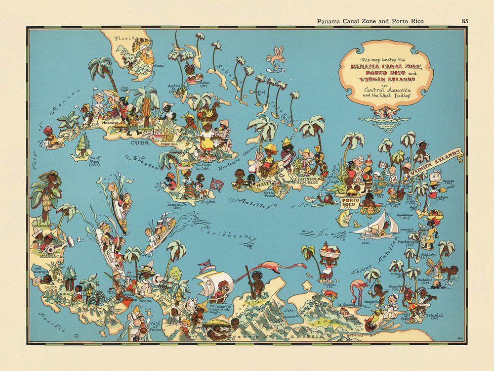 Pictorial Map of Caribbean & Central America by Ruth Taylor White, 1935: Panama Canal, Puerto Rico, Havana, San Juan, Santo Domingo