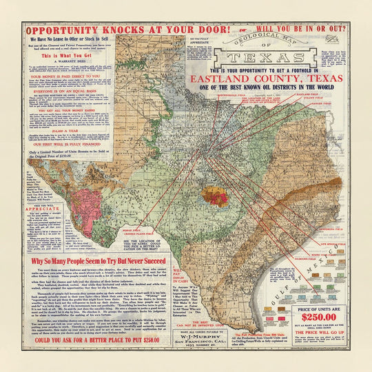 En ese momento, se había descubierto una gran cantidad de petróleo en el condado de Eastland y se produjo una pluma de aceite. Los materiales promocionales, como este mapa, se estaban distribuyendo ampliamente, diciéndole a los inversores a través de los EE. UU., "Las oportunidades llaman a su puerta, ¿estará dentro o fuera?"