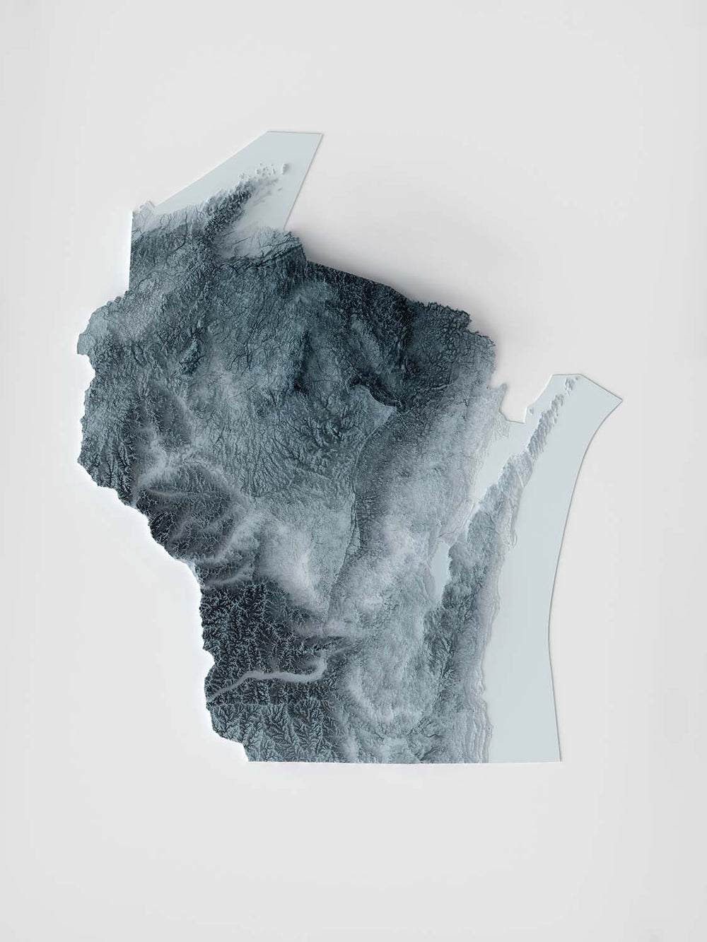 La interacción de luz y sombra a través del mapa da definición a las tierras altas y los valles fluviales, asegurando que los contornos y el carácter del paisaje de Wisconsin se destaquen en un detalle impactante. Las morenas glaciares, los lagos en forma de olla y los ríos serpenteantes se destacan con suaves gradaciones en el relieve, mostrando la mezcla única de belleza salvaje y encanto pastoral del estado.