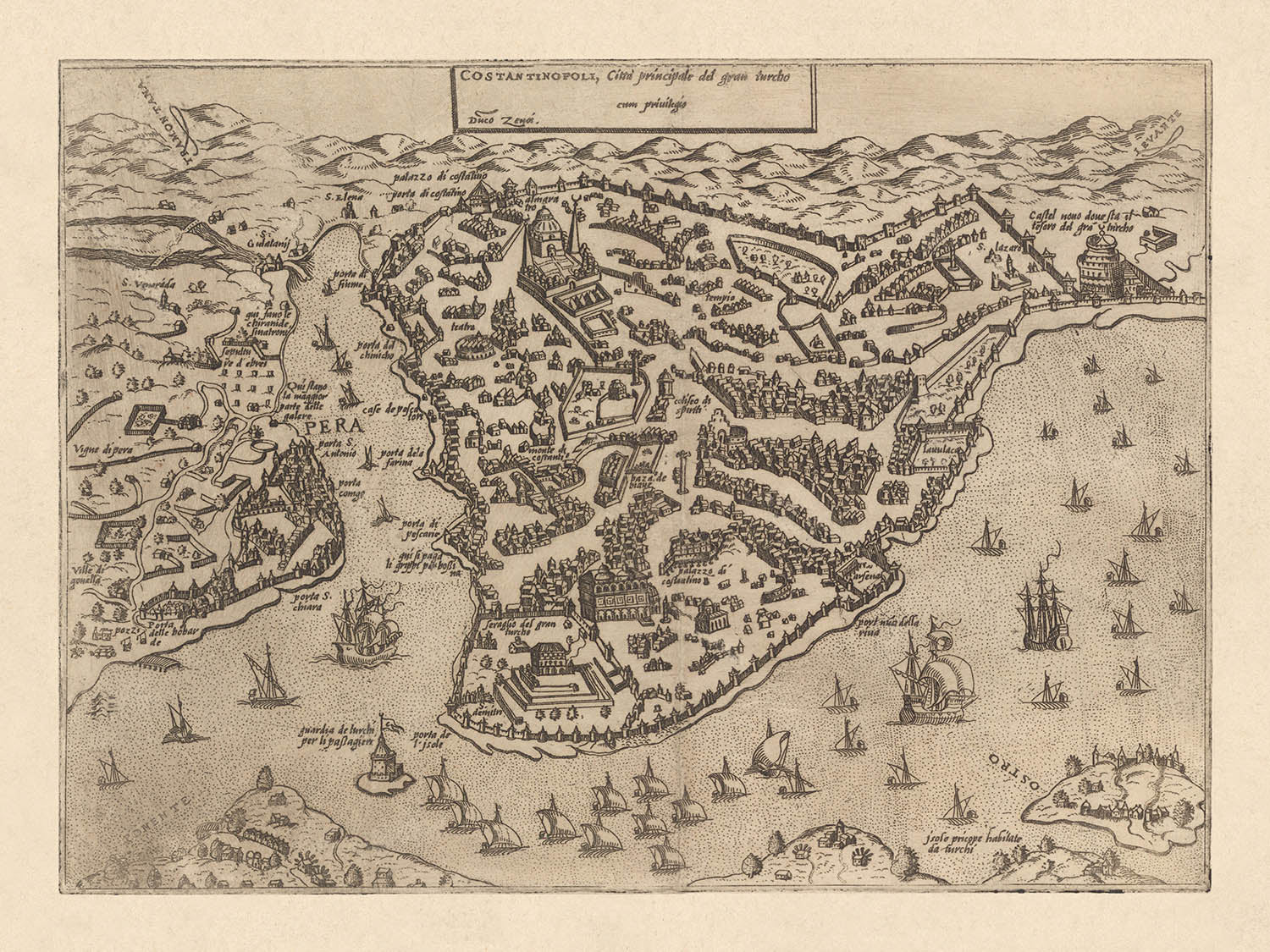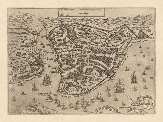 Beyond the city’s core, the map elegantly captures the vibrant waterfronts of the Golden Horn and the Bosphorus Strait, both teeming with ships and maritime activity. The Galata district, with its own fortifications and towers, is prominently featured across the bay, reflecting the cosmopolitan character of this bustling port and its vital role in trade and diplomacy. The depiction of harbours, docks, and lively waterside scenes further underscores Constantinople’s status as a crossroads of continents and cultures.