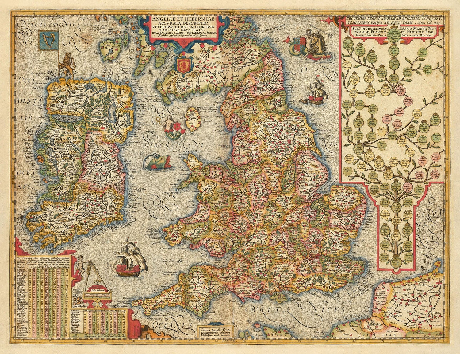 Antigua Mapa de Color de Inglaterra e Irlanda en 1605 por Abraham Ortelius: Historia y Árbol Genealógico de la Monarquía