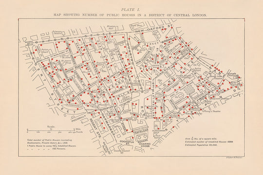 - El mapa proporciona una instantánea del número de tabernas en un distrito del centro de Londres a finales del siglo XIX.