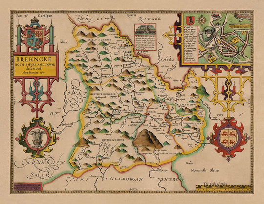 Esta antigua, colorida y extremadamente rara mapa muestra el antiguo condado de Brecon (o Brecknockshire como se conocía entonces), Gales en 1611. Fue creado por John Speed y grabado por Jodocus Hondius, y publicado originalmente en "El Teatro del Imperio de Gran Bretaña" de Speed.