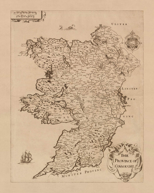 Este mapa de la Provincia de Connacht, publicado en 1685 por Sir William Petty, es una representación detallada e informativa de esta región histórica de Irlanda. El mapa cubre toda la provincia, que abarca los condados de Galway, Leitrim, Mayo, Roscommon y Sligo, y proporciona una gran cantidad de información sobre la geografía, historia y cultura de la región.