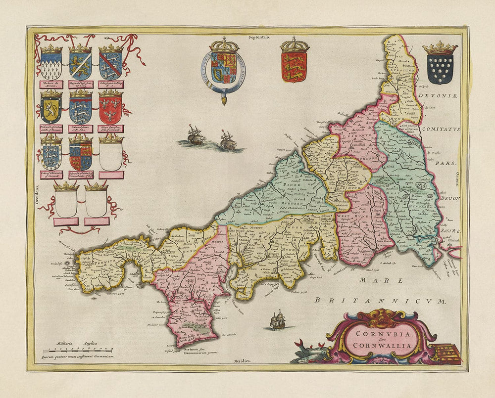 Este es un mapa antiguo de colores completos de Cornwall, extremadamente raro, creado por el maestro cartógrafo Joan Blaeu desde su taller en Ámsterdam y publicado originalmente en este Theatrum Orbis Terrarum Sive Atlas Novus en 1665.