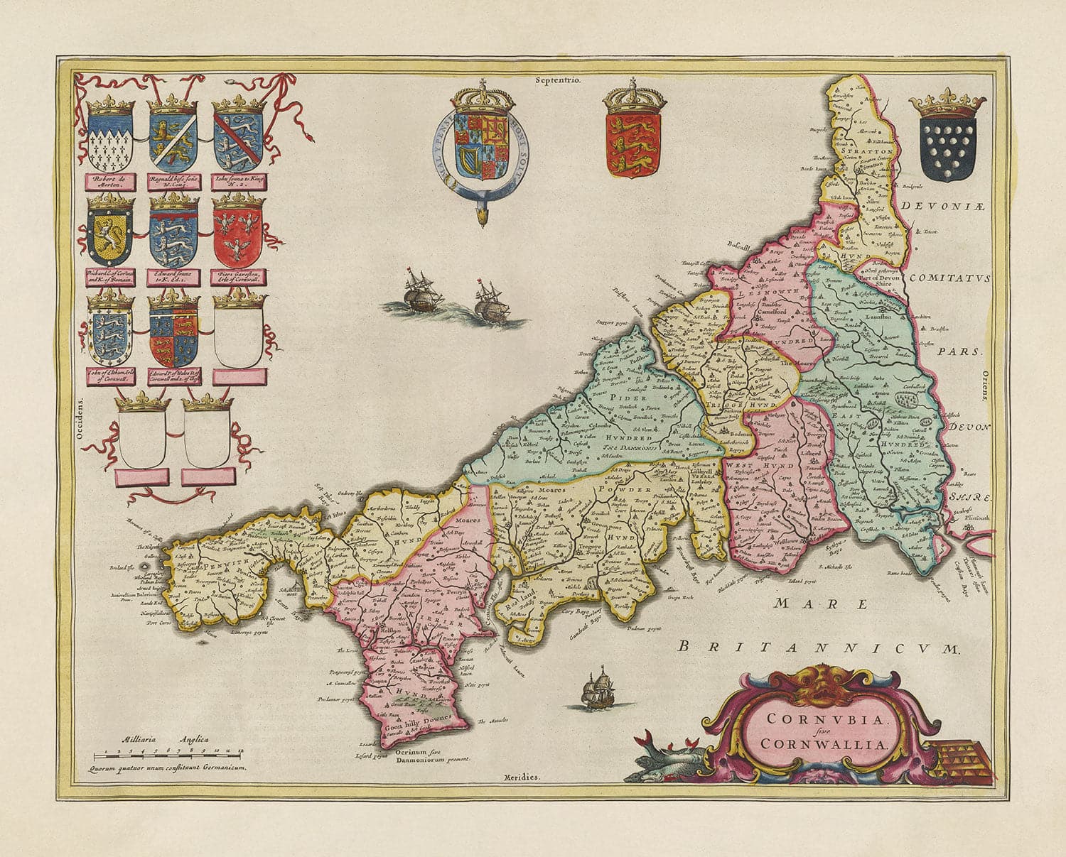 Viejo Mapa de Cornwall en 1665 por Joan Blaeu: Penzance, St Ives, Falmouth, Tierres End, Padstow, Redruth, País Oeste