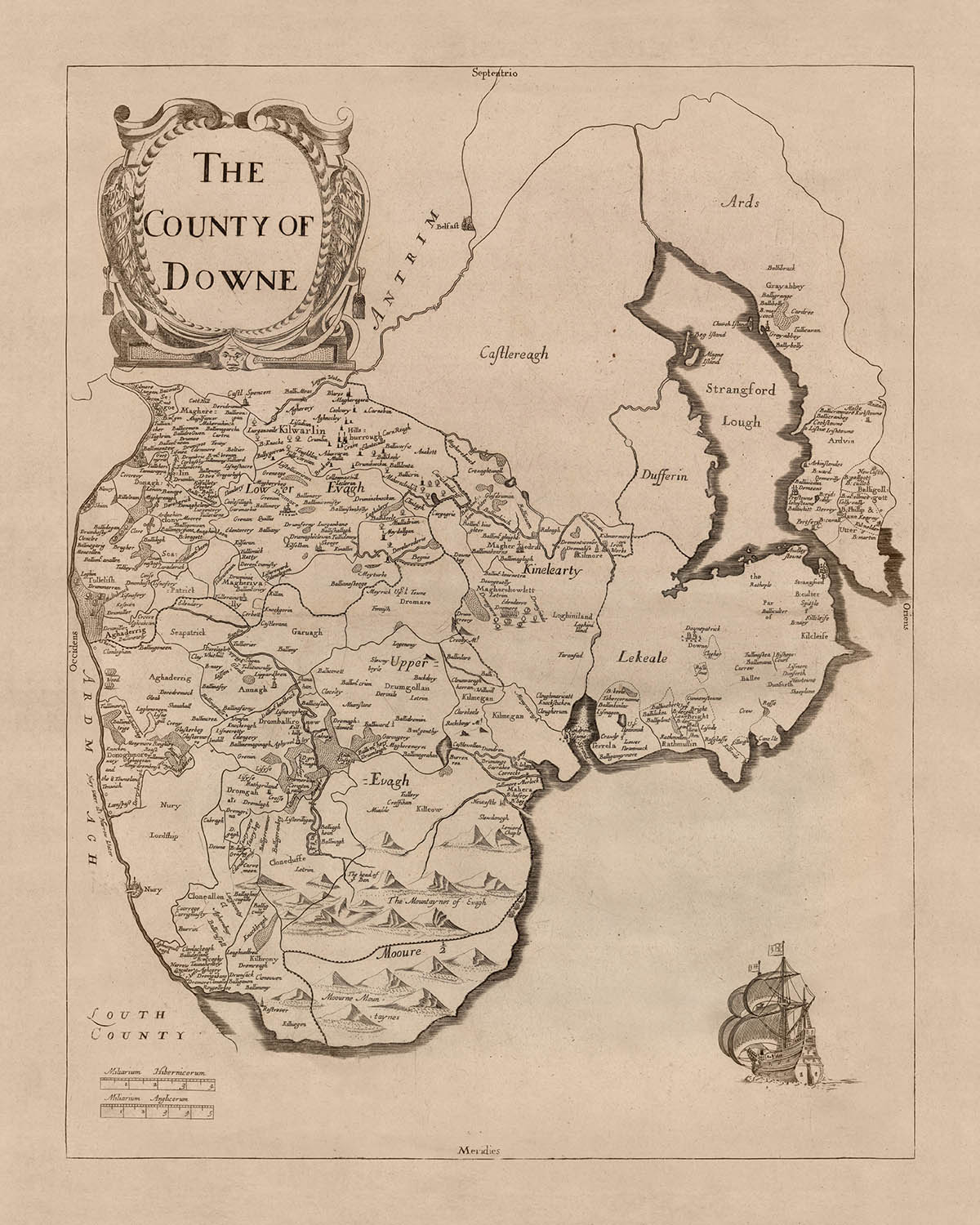 Mapa antiguo del Condado de Down por Petty, 1685: Bangor, Donaghadee, Hillsborough, Montañas Mourne, Tollymore