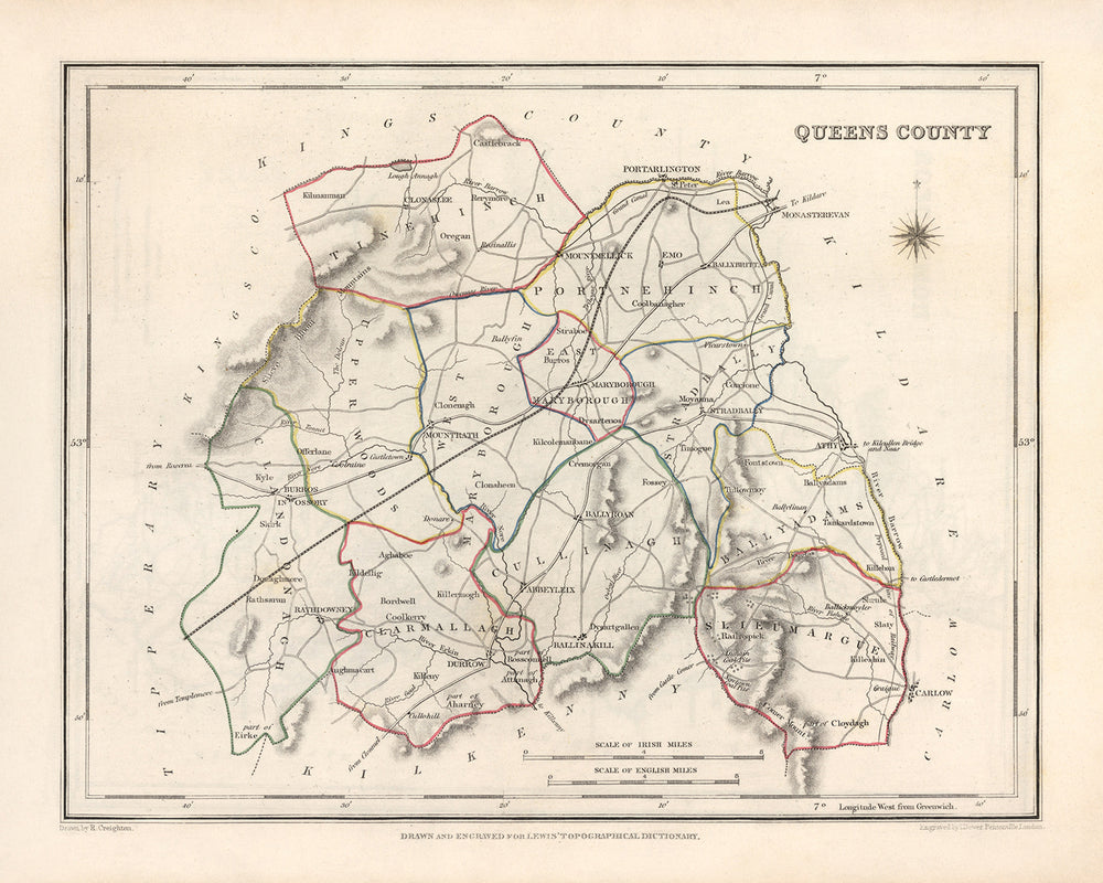 Este antiguo mapa del condado de Laois (Queen), Irlanda, creado por Samuel Lewis en 1844, ofrece una visión fascinante del paisaje histórico de la región. Con sus detalles exquisitos y su cartografía intrincada, este mapa es una pieza histórica notable que cautivará a cualquier entusiasta de los mapas o amante de la historia.