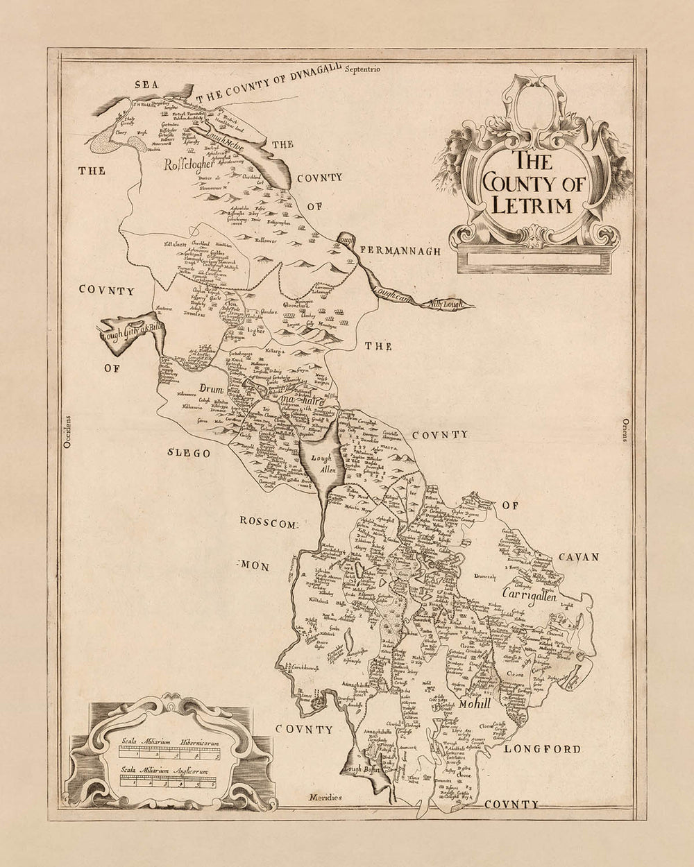 Antigua mapa del condado de Leitrim por Petty, 1685: Carrick-on-Shannon, Jamestown, Ballinamore, Mohill, Carrigallen, Down Survey