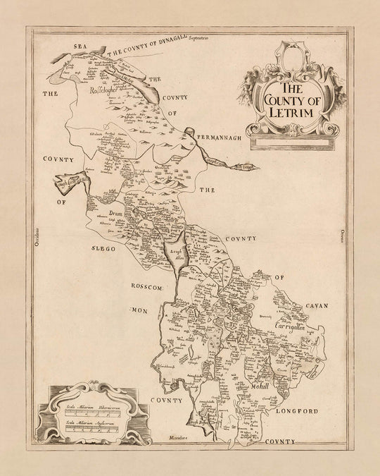 Este mapa del Condado de Leitrim, publicado en 1685 por Sir William Petty, es un mapa político y físico detallado que proporciona una gran cantidad de información sobre el condado y sus alrededores. El mapa se basa en el Down Survey de Irlanda, que se llevó a cabo entre 1656 y 1658, y se considera la primera encuesta de tierras detallada a escala nacional en cualquier parte del mundo.