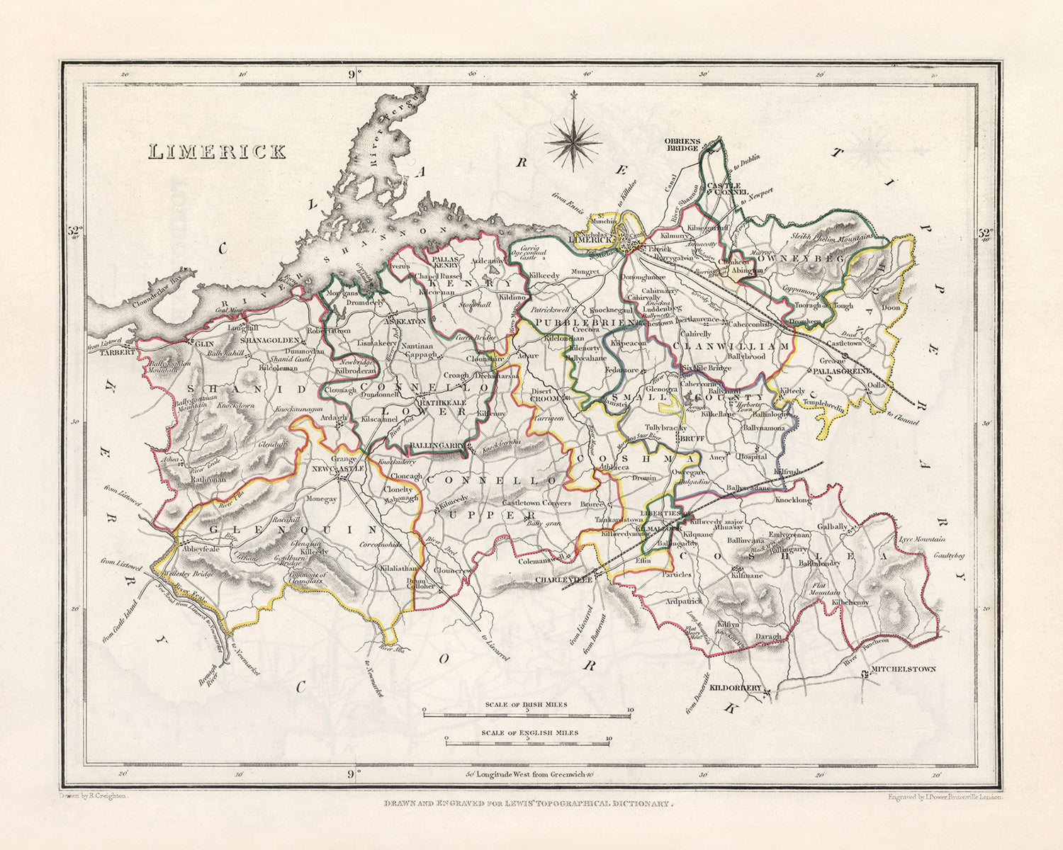 Mapa antiguo del condado de Limerick por Samuel Lewis, 1844: Adare, Askeaton, Bruree, Croom, Kilmallock