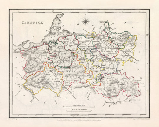 Poseer este mapa antiguo de Limerick de Samuel Lewis, creado en 1844, le permite profundizar en el pasado y apreciar la importancia histórica del condado de Limerick, Irlanda. Con sus detalles meticulosos y su rico contexto histórico, este mapa es una pieza preciada para cualquier entusiasta de la historia o amante de la cartografía fina.