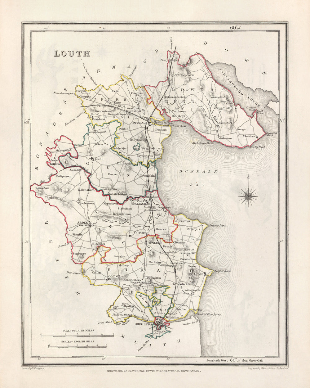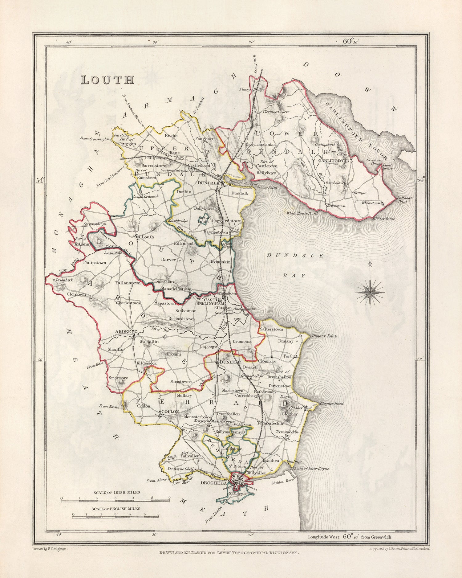Mapa antiguo del condado de Louth por Samuel Lewis, 1844: Dundalk, Drogheda, Ardee, Carlingford, Península de Cooley