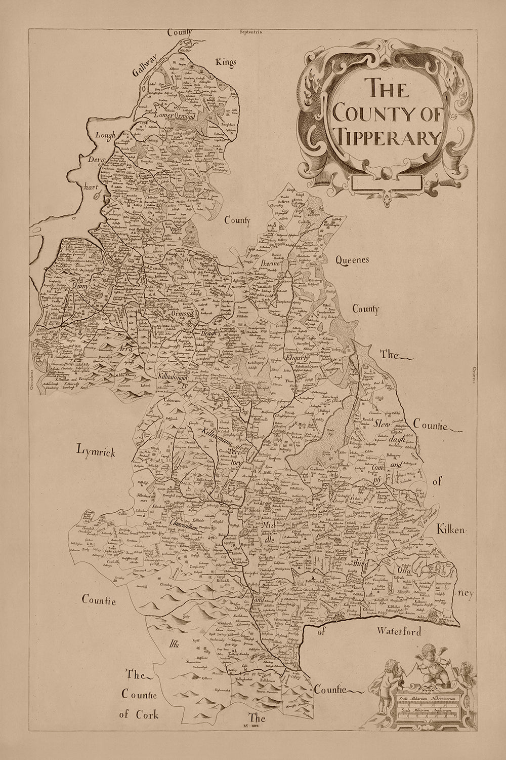Este mapa del condado de Tipperary, publicado en 1685 por Sir William Petty, es un mapa político y físico detallado que proporciona una gran cantidad de información sobre el condado. El mapa se basa en el Down Survey de Irlanda, que fue el primer estudio territorial detallado a escala nacional en cualquier parte del mundo. El mapa de Petty muestra carreteras, puentes, ciudades, lugares, obispados y arzobispados que estaban presentes a finales del siglo XVII en Irlanda. También se muestran gráficamente colinas, bosques, ríos, lagos y lagos.