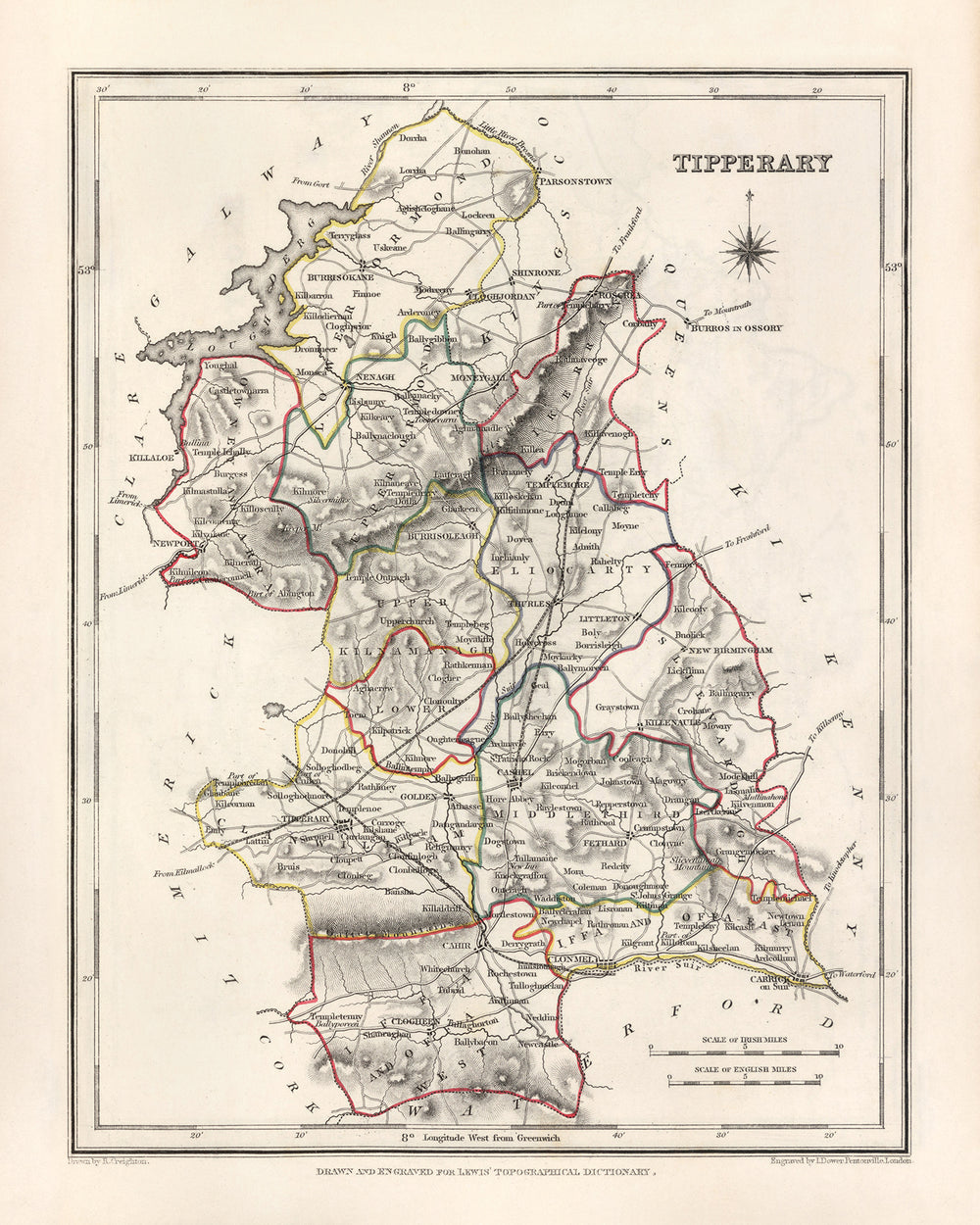 Mapa antiguo del condado de Tipperary por Samuel Lewis, 1844: Clonmel, Nenagh, Thurles, Cashel, Cahir
