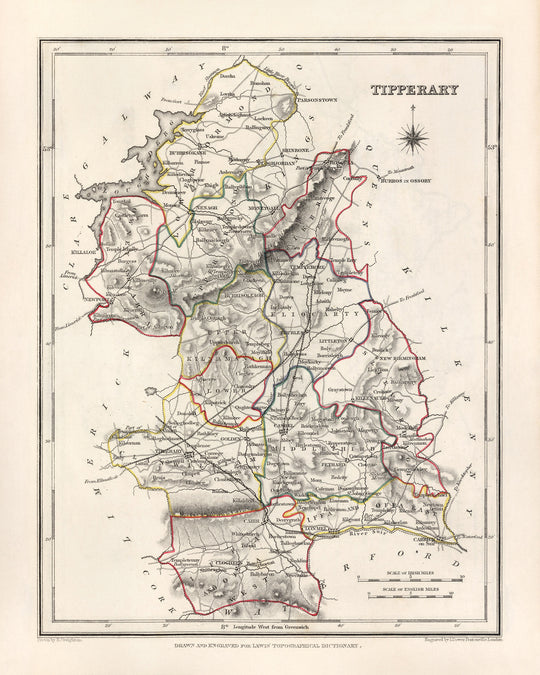 Descubre la rica historia del Condado de Tipperary con esta reproducción de alta calidad del "Antiguo Mapa de Tipperary" por Samuel Lewis, publicado originalmente en 1844. Este mapa detallado y históricamente preciso muestra las fronteras del siglo XIX, asentamientos y geografía del condado en exquisito detalle.