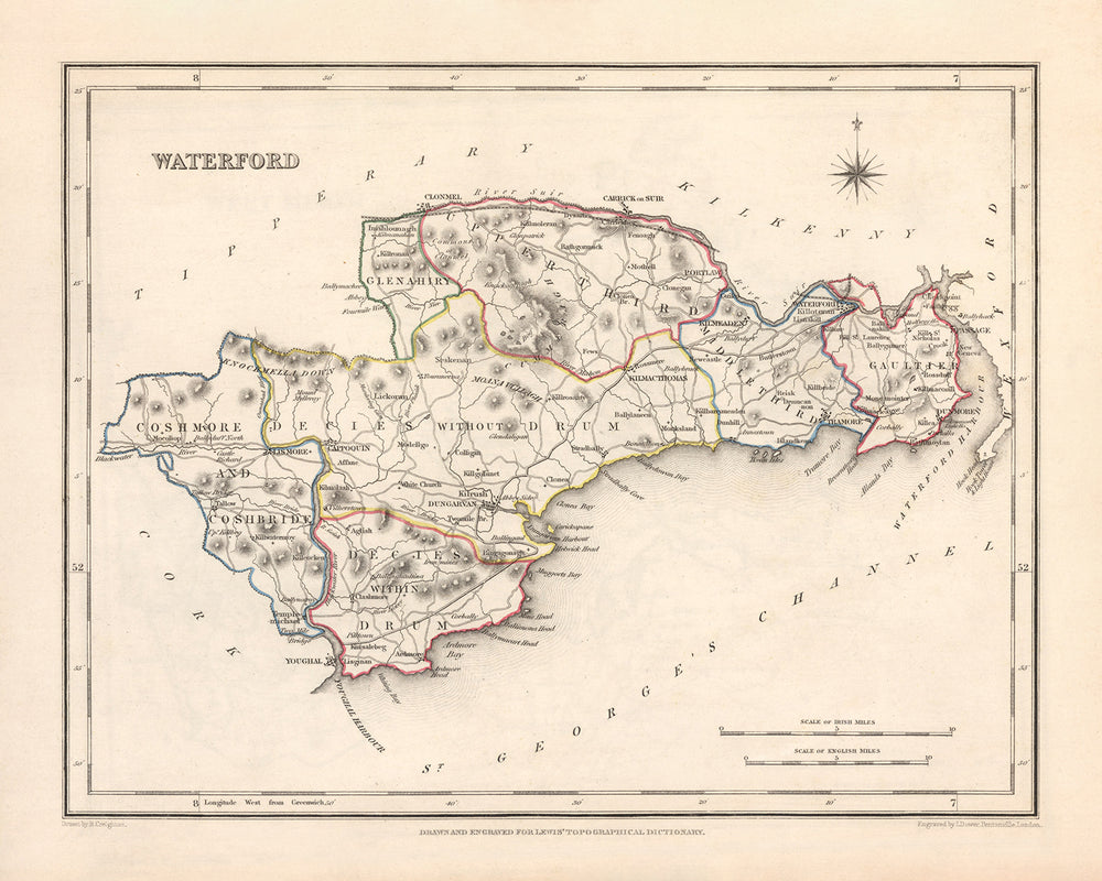 Mapa antiguo del condado de Waterford por Samuel Lewis, 1844: Dungarvan, Lismore, Cappoquin, Tramore, Dunmore East