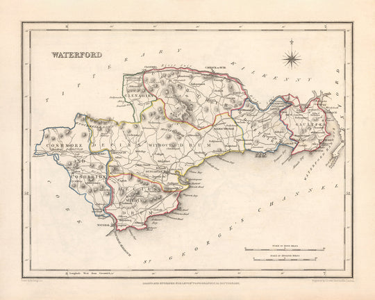 Este antiguo mapa de Waterford realizado por Samuel Lewis en 1844 muestra los límites históricos del condado de Waterford, Irlanda, y ofrece una visión del pasado. Con sus detalles intrincados y su exquisita artesanía, este mapa es una pieza fascinante de la historia que captura la esencia de la región durante ese período.