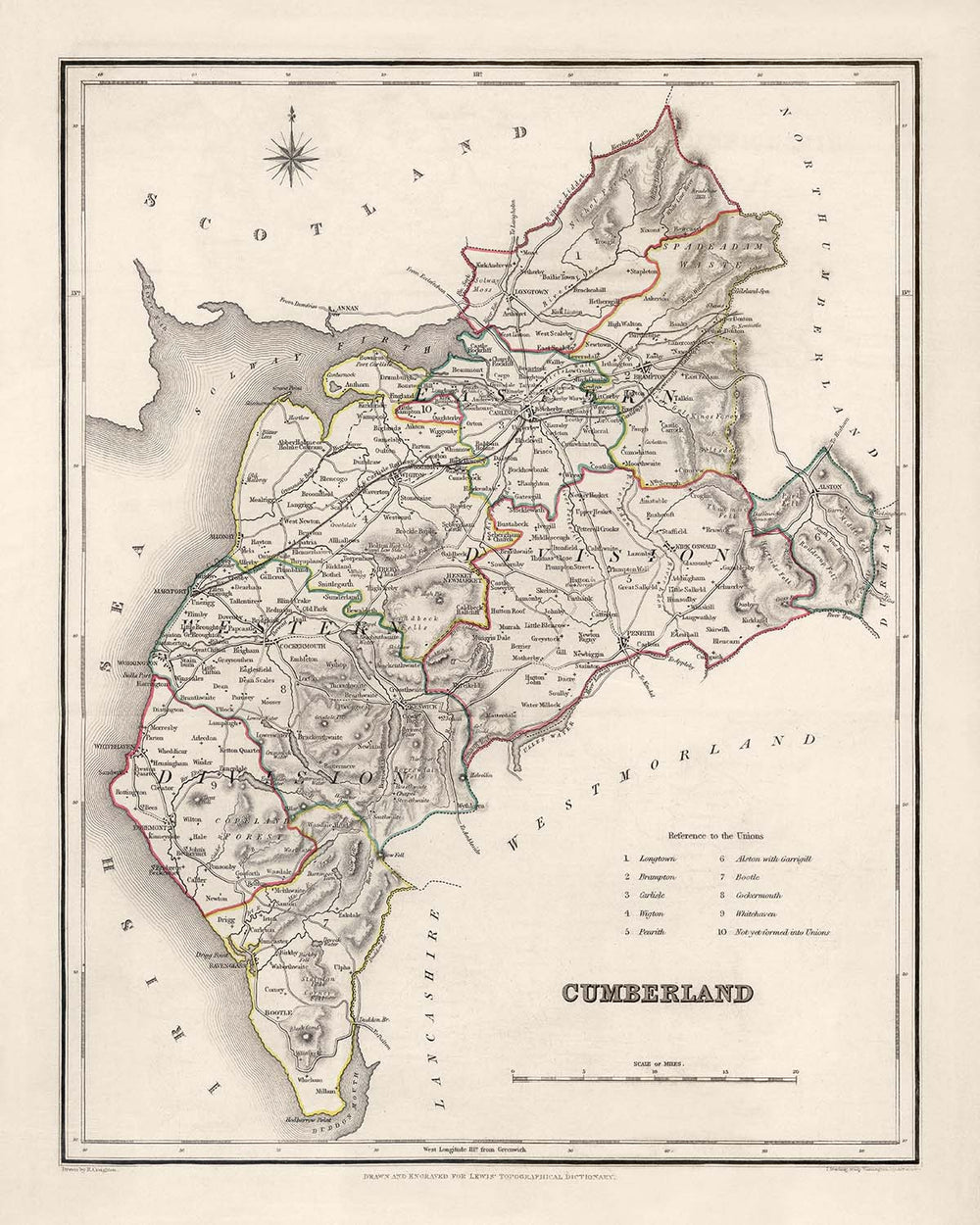 Mapa antiguo de Cumberland por Samuel Lewis, 1844: Carlisle, Whitehaven, Workington, Penrith y Keswick