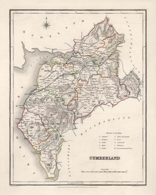 Sumérgete en la rica historia de Cumberland, Inglaterra, con el "Mapa antiguo de Cumberland de Samuel Lewis, 1844". Este mapa meticulosamente elaborado sirve como una puerta de entrada al pasado, permitiéndole explorar los límites históricos de la región, los asentamientos notables y las cautivadoras características naturales. Si es un entusiasta de la historia, un aficionado a la cartografía o simplemente aprecia la belleza de una época pasada, este mapa es una adición notable a cualquier colección.