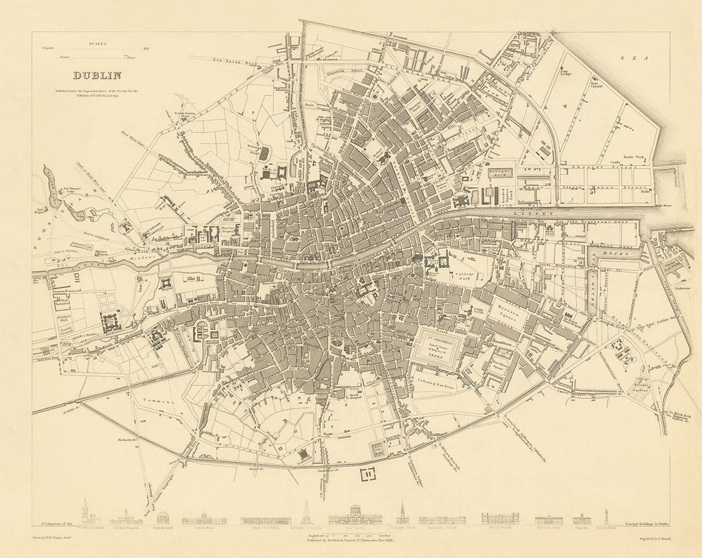 A lo largo de la parte inferior del mapa hay bocetos laterales de algunos de los principales monumentos de Dublín, incluyendo Four Courts, el Banco de Irlanda y el Testimonio de Wellington.