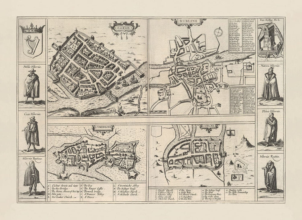 Publicada en 1618 por Georg Braun y Frans Hogenberg, esta es una de las primeras mapas impresos de las ciudades irlandesas de Dublín, Limerick, Cork y Galway. Si Shakespeare hubiera visitado Irlanda en ese entonces, así es como se verían estas ciudades. Este mapa fue publicado por primera vez en Civitates Orbis Terrarum - las Ciudades del Mundo - que era una obra maestra cartográfica que presentaba 546 mapas.