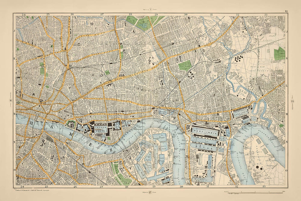 Mapa antiguo del este y centro de Londres, 1900: Torre de Londres, El Támesis, Isla de Perros, Muelles de Londres, Shoreditch