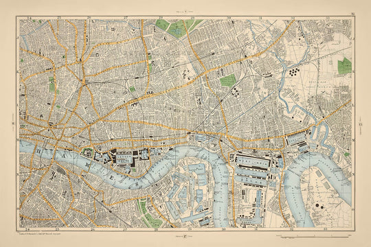El mapa presenta de manera prominente el icónico río Támesis, una arteria que se entrelaza en el corazón de Londres. Esta vital vía fluvial, representada con precisión, conecta áreas clave como los Muelles de Londres y los Muelles de las Indias Occidentales, que alguna vez fueron los epicentros del comercio global. El mapa no solo ilustra la disposición geográfica, sino que también cuenta la historia del comercio y la industria que alimentaron el crecimiento de la ciudad durante la era victoriana.